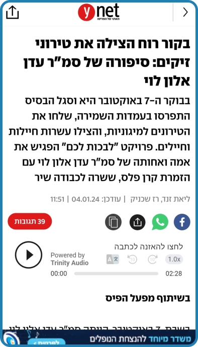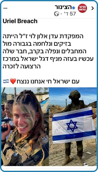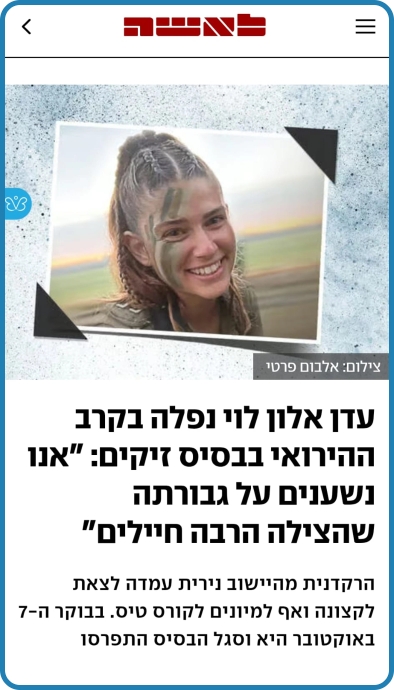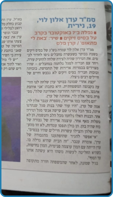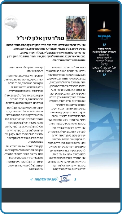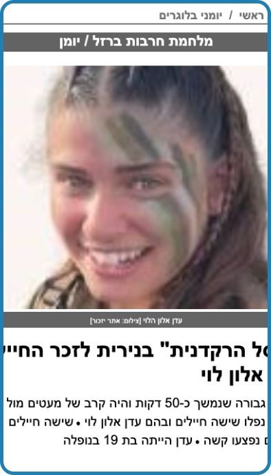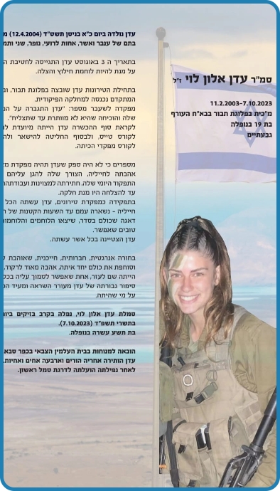 אלון לוי אמיתית. אל תדאגי עדן, כבר אלפי חיילים ממשיכים את הדרך ושולחים טילים בשמך, חודרים לעזה בשמך, כל המשפחה והחברים שלך בשטח ונלחמים בשמך וגם התור שלי יגיע ומבטיח לך שגם אני אמשיך את דרכך.